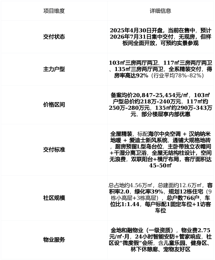 在售状态 : 2025年4月开盘,当前在售中 , 2026年7月集中交付 , 全部为精装交付 ,主力户型为 103㎡、117㎡、135㎡三房 , 备案均价20,847–25,454元/㎡ , 总价区间218万–343万元 , 净得房率高达92% , 苏州市场罕见空间利用率标杆 。