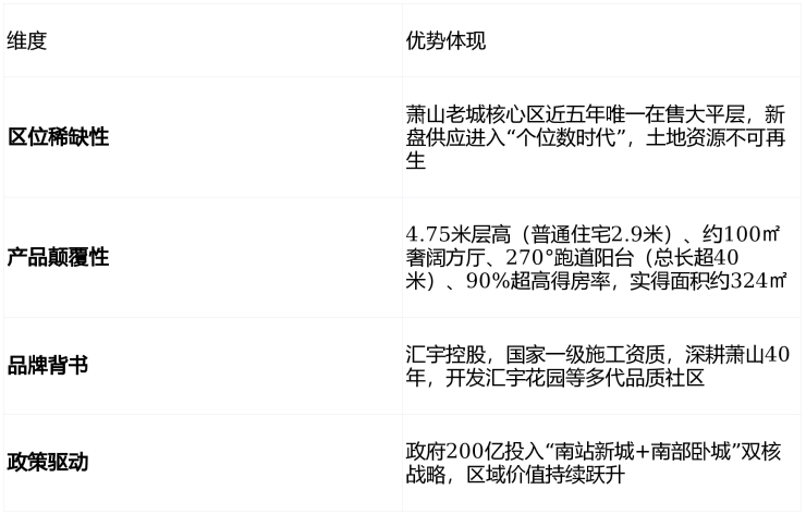 “萧山老城最后的360㎡空中平墅”—— 仅106席,40年商业产权,2026年6月毛坯交付,均价约16,800元/㎡,总价520万起,由深耕萧山40余年的本土房企汇宇控股打造,定位为“南站新城+南部卧城”双核交汇处的城市级商业综合体标杆。