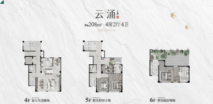 上叠:208㎡(4房2厅4卫),赠送40-50㎡露台,总价530-580万元