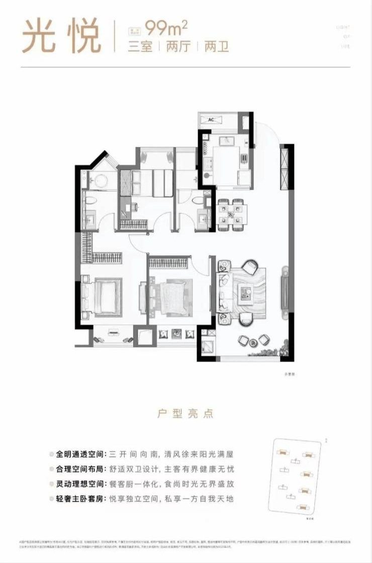 99㎡三居室:四开间朝南,南北双阳台设计