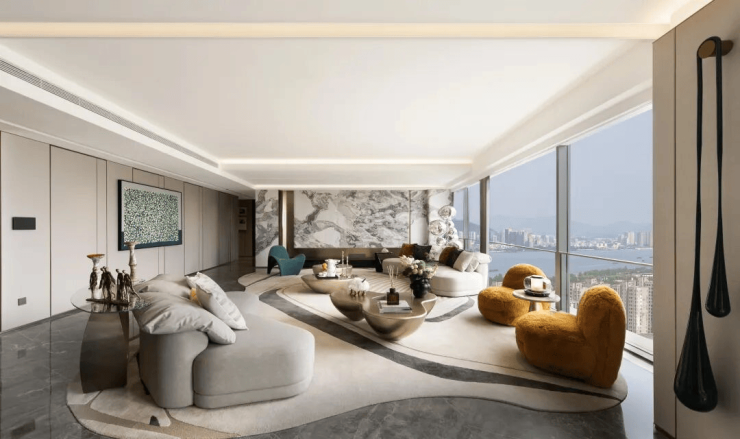 建面约230–650㎡户型配备IMAX巨幕落地窗,将钱塘江潮、奥体霓虹、城市天际线尽收眼底,形成不可复制的“视觉资产” 。约420㎡“超跑”四房更拥有14米公区弧形巨幕面宽,复刻兰博基尼“闪电”型格 。