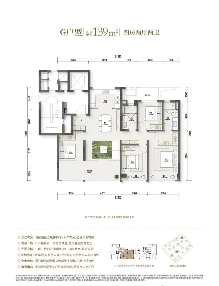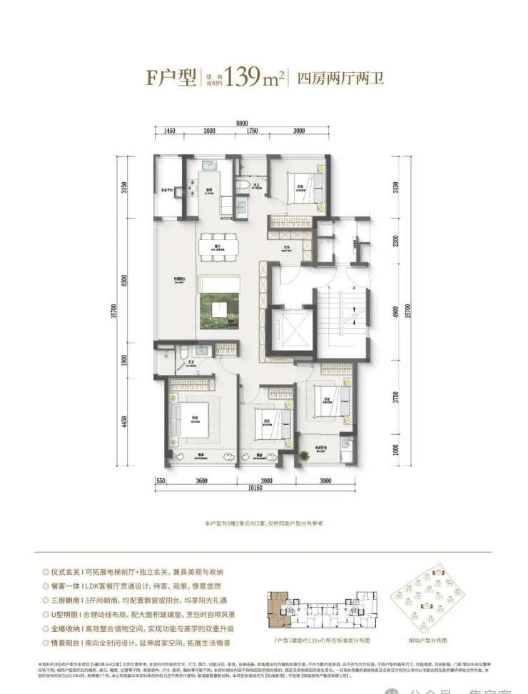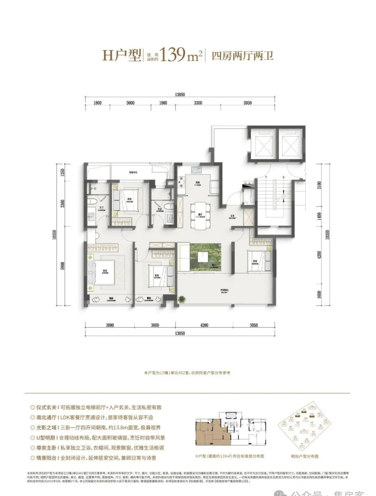 如果预算再多一点,家里人多一点,建面约128㎡边套四房户型,同样也是边厅户型,空间更大,功能性更强,总价相比市面上的139㎡还是亲民了许多。此外,作为板块首个封闭式阳台的住宅项目,还是之江首个全屋五重收纳功能柜子全赠送的项目。