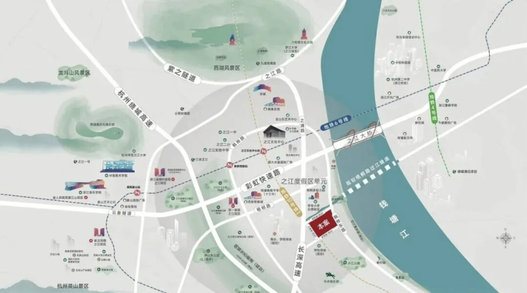 一条钱塘江,串联【钱江新城CBD】【滨江板块CAZ】【之江板块CED(中央生态区)】三大中芯。 之江,是杭州主城区西湖景区生态王者,定位杭州CED中央生态区,兼具生态调节、文化展示,以及创新孵化等功能。区域内未来住宅增值潜力巨大。