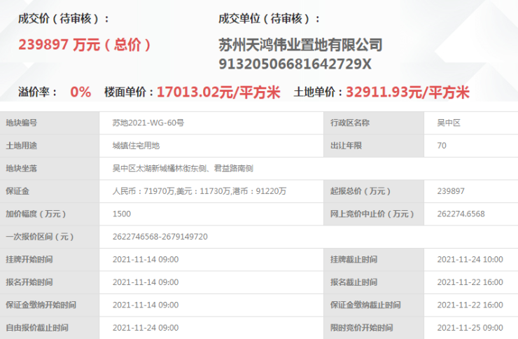 去年11月底,天鸿伟业(吴中经发)以总价23.9亿竞得,成交楼面价17013元/㎡;后确定仁恒操盘。