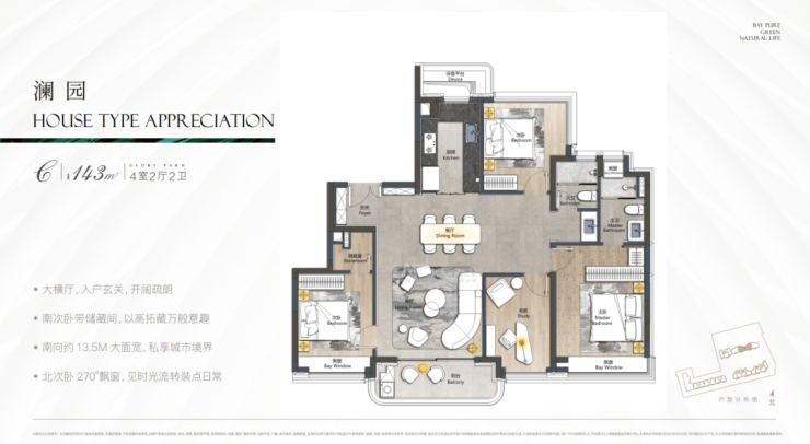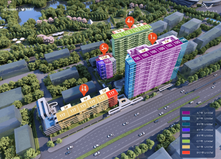 主力为105–143㎡三至四房,得房率78%,无暗卫、无浪费面积;