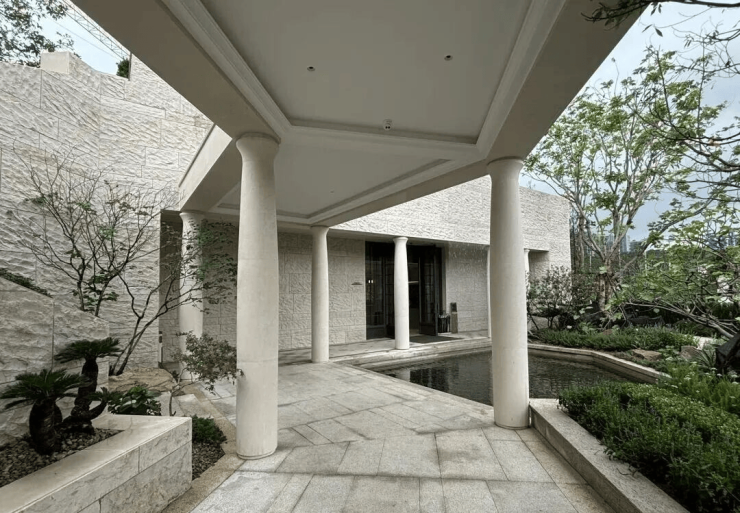 项目首创“两芯一轴多院落”布局,以中央溪谷水景轴串联三大组团,融合莫奈花园、台地景观、镜面水池、加拿利海枣阵列(单棵价值超8万元)。
