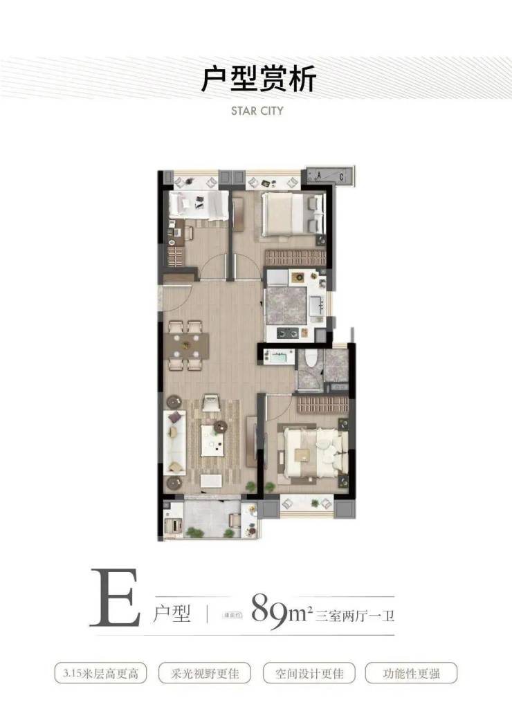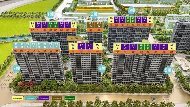 72-88㎡两至三房:方正全明格局,适合刚需客户。72㎡户型采用动静分区设计,配备观景飘窗;88㎡实现三开间朝南,U型厨房操作台长达4.8米,空间利用率极高。
