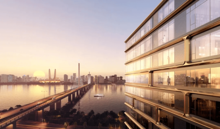 建筑设计:项目由亚洲建筑师协会金奖得主孟凡浩及其团队line+建筑事务所操刀,外立面以金色铝板曲面结合大尺度玻璃幕墙,灵感源自钱塘江“潮涌”。