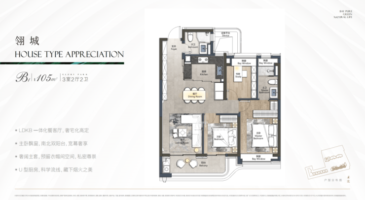 105㎡三房实现“三开间朝南”,客厅面宽≥4.2米,主卧带独立卫浴;
