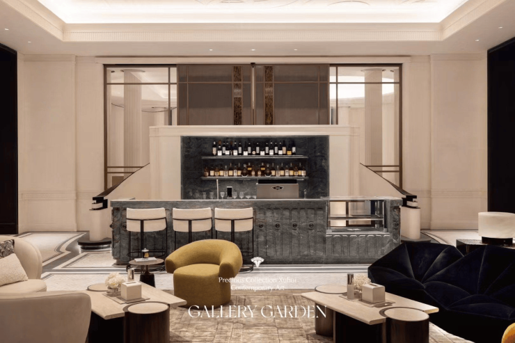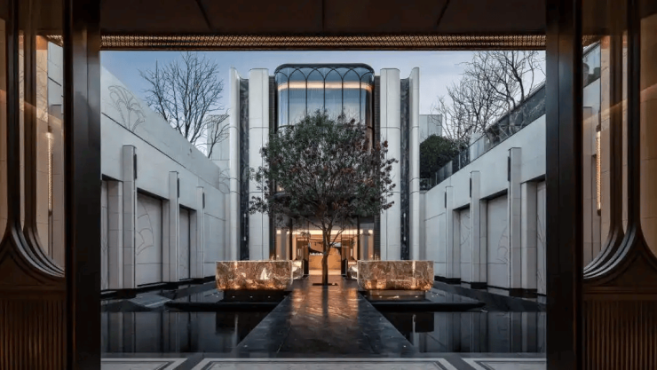 外立面采用贝金米黄大理石与老虎玉石材,搭配香槟金格栅塔冠,复刻百年海派建筑精髓