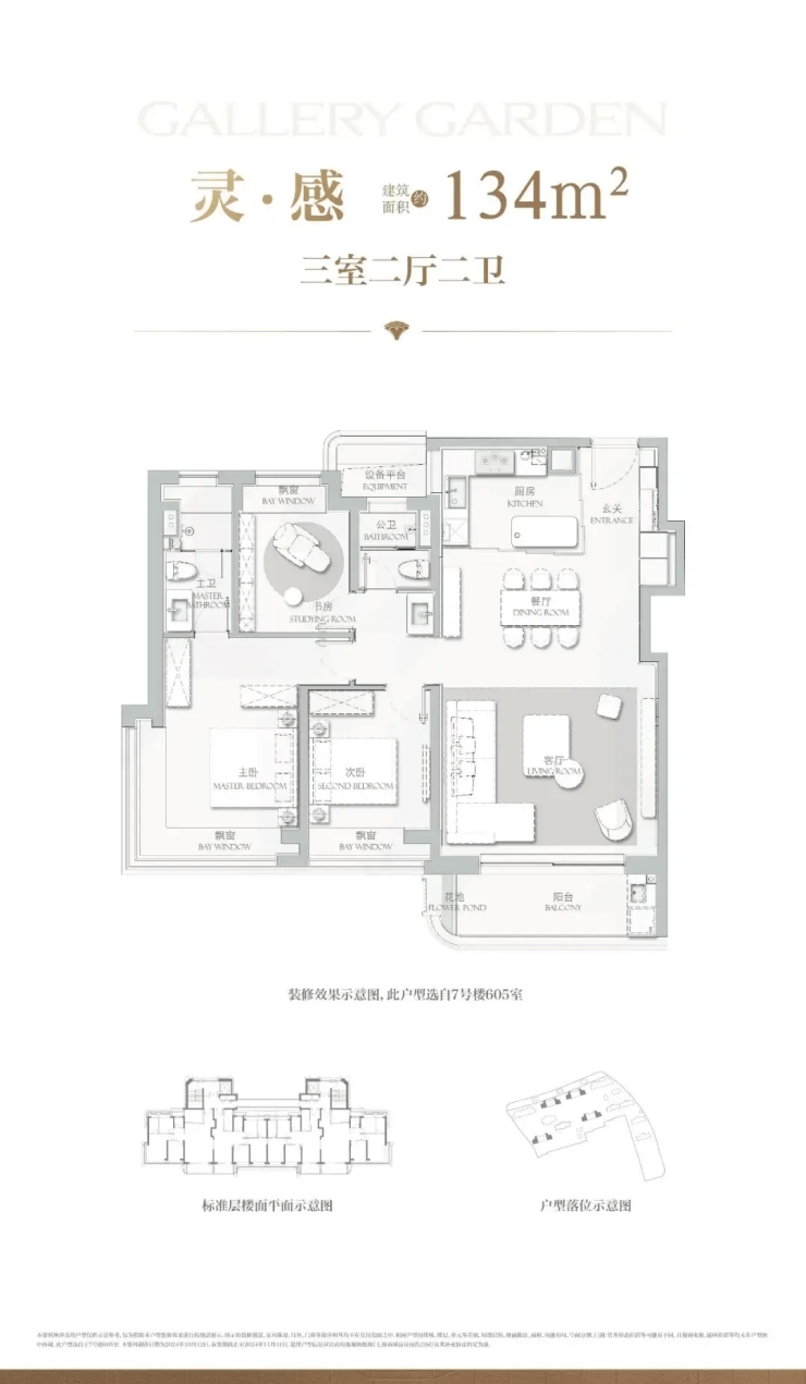 120–134㎡三房:主卧270°飘窗,客厅面宽超4.7米,厨房预留岛台,适合三代同堂或社交型家庭