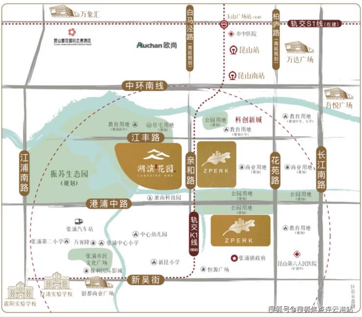 交通:距离高铁昆山南站直线距离仅约6公里,规划中的K1线,预计将从项目东侧经过,成为联通南北的轨道交通主干线。K1线未来将在玉山广场站与S1线换乘(规划),可抵达苏州、上海等地,真正实现“三地同城化”。