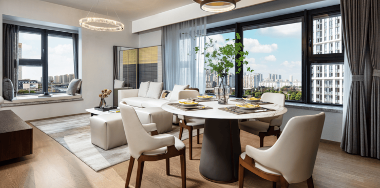精装交付标准 :配备博士地暖、日立中央空调、松下新风系统,厨房采用老板三件套,卫浴为科勒五金件,隔音性能达45分贝