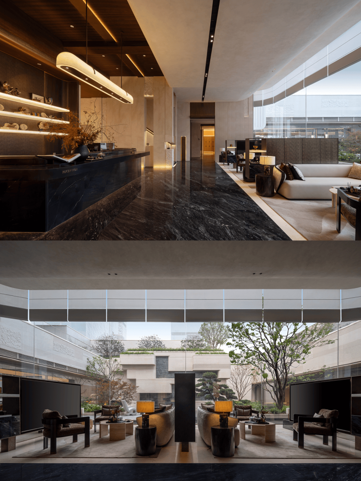 外立面采用四面铝板+大面积玻璃幕墙,搭配暖金色金属线条,灵感源自京杭大运河波光,随日光流转呈现光影变化,打造现代东方隐奢风格 。