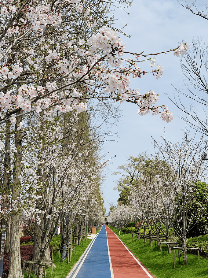 /跑道,漫步道两侧种满了多季樱花(共9种),其中从日本移植了414棵名贵樱花品