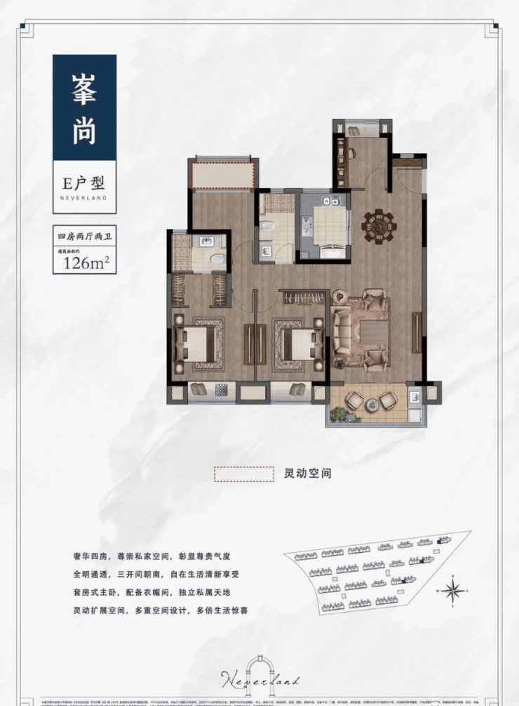 126㎡的四房设计可以说相当宽敞,无论是餐厅还是主次卧,都真正做到了舒适和实用的统一!这样好的户型不止收纳功能强,采光通风好,还可以满足不同家庭对于居住的需求!