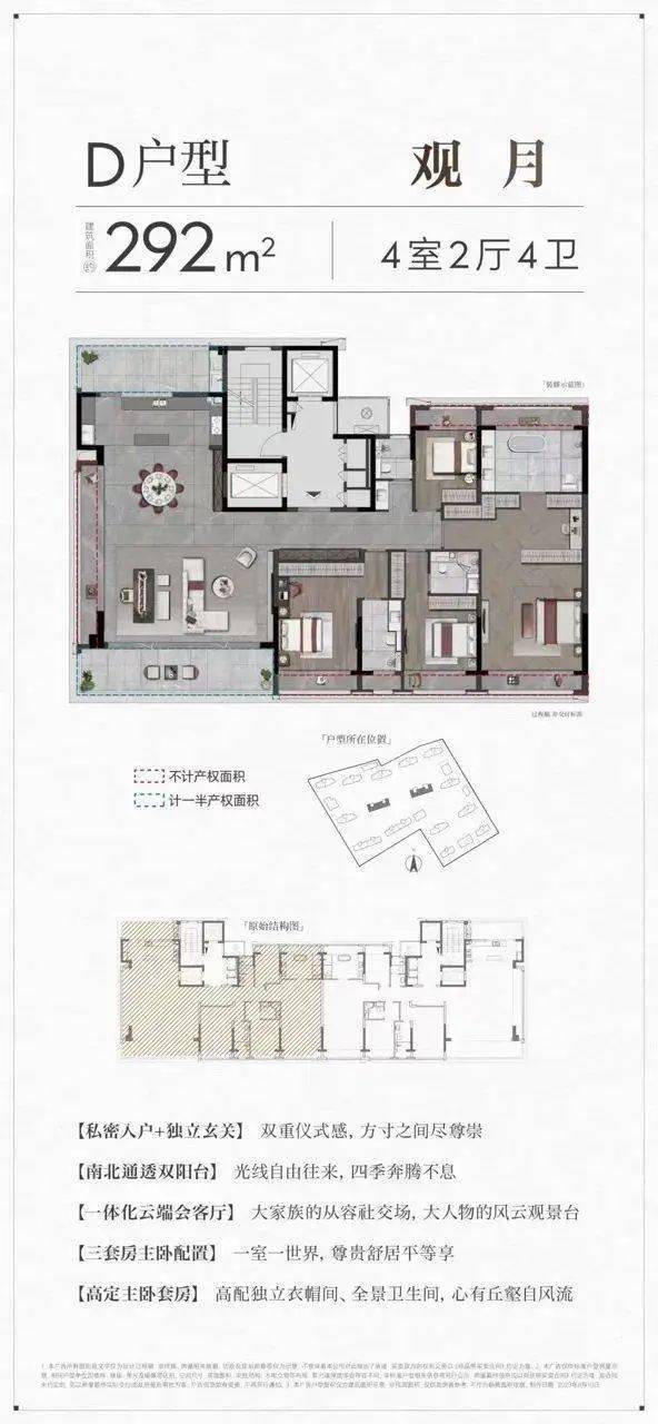 建筑面积约165-292㎡天际大平层。以南向4-5面宽,LDKG一体化大宅洄游动线,多套房设计、全景视野,传递内在丰盈,外显从容的境界。