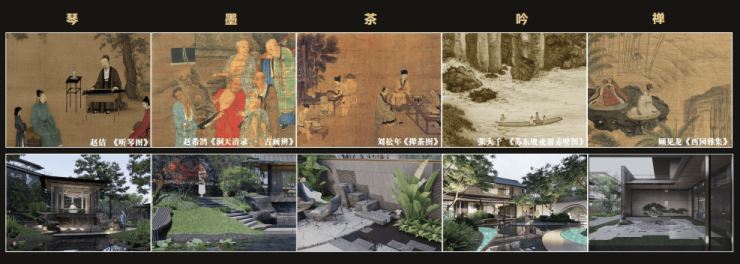 正如沈括《梦溪笔谈》中提到的“与之酬酢于心目之所寓者 : 琴 , 棋 , 禅 , 墨 , 丹 , 茶 , 吟 , 谈 , 酒 , 谓之 ' 九客‘”,青云瑧境取其中的“琴、墨、茶、吟、禅”五大宋式生活美学,巧妙融入了这个即将开放的示范区内!
