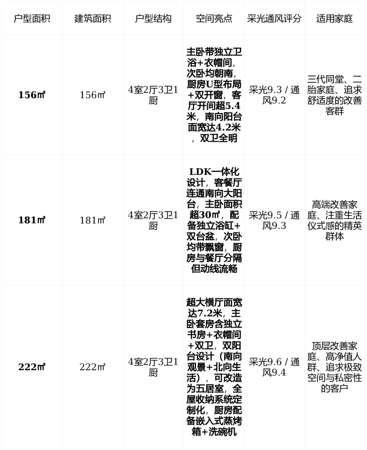 主力产品 : 全系为156㎡、181㎡、222㎡三款四室两厅三卫大平层 , 无三房户型 , 定位纯改善型高端住宅 。