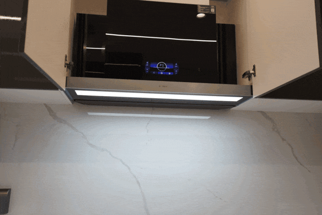 厨房方面,采用方太高阶版三件套(全隐升降款油烟机、三眼灶具、15件套大容量洗碗机);建霖智家的大单水槽&抽拉龙头;奥普凉霸;还有灶具背景墙用的是一整面岩板设计……