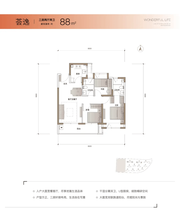 约88–89㎡三房两厅两卫:南北通透,主卧套房设计,约6米双联阳台,空间感超越同级产品