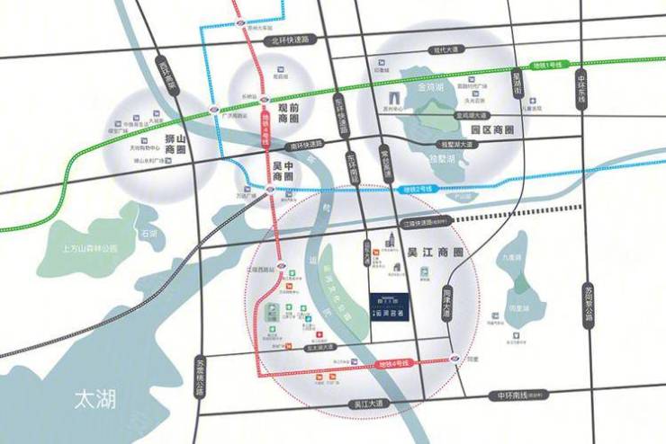 主干道:紧邻环太湖大道、东山大道,连通太湖景区及苏州主城区