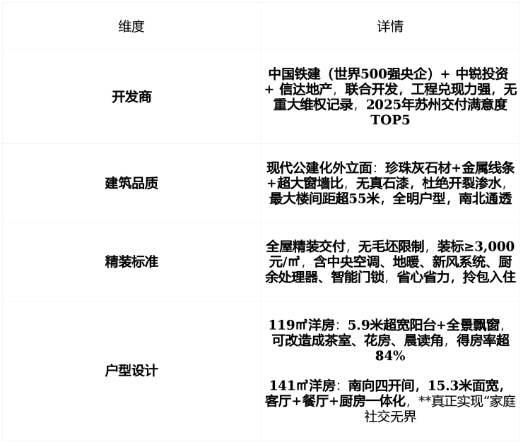 核心优势:中国铁建+中锐+信达联合开发+中铁建物业(2.44元/㎡·月)+容积率仅1.2,绿化率37%+“宋锦缂丝”灵感2轴4巷10园苏式园林+119㎡洋房标配5.9米超宽阳台+全景飘窗+下叠带40–100㎡…
