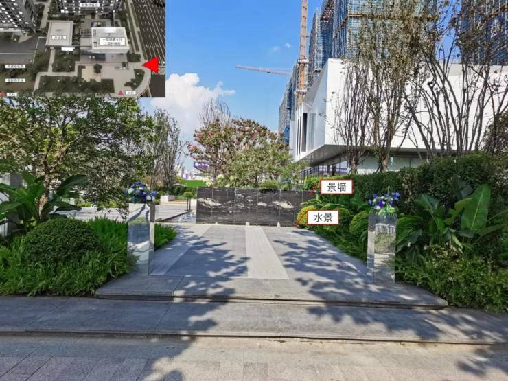 下面这张图展示的是人行入口一,正对着景墙和水景。