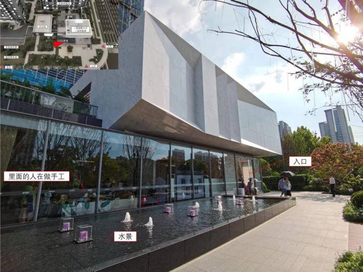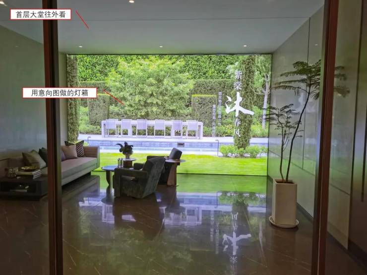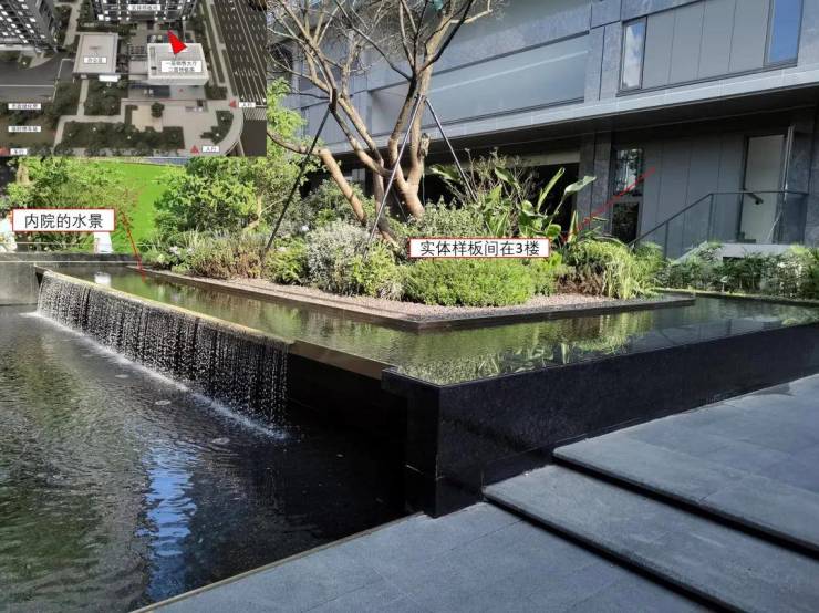 下面这张图呈现的是水景 + 落地玻璃 + 手工工艺的巧妙结合。