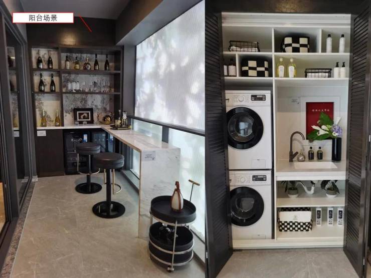 下面这张图,是花了不少心思打造的阳台两侧的两个场景,这是176㎡样板间的独特设计。