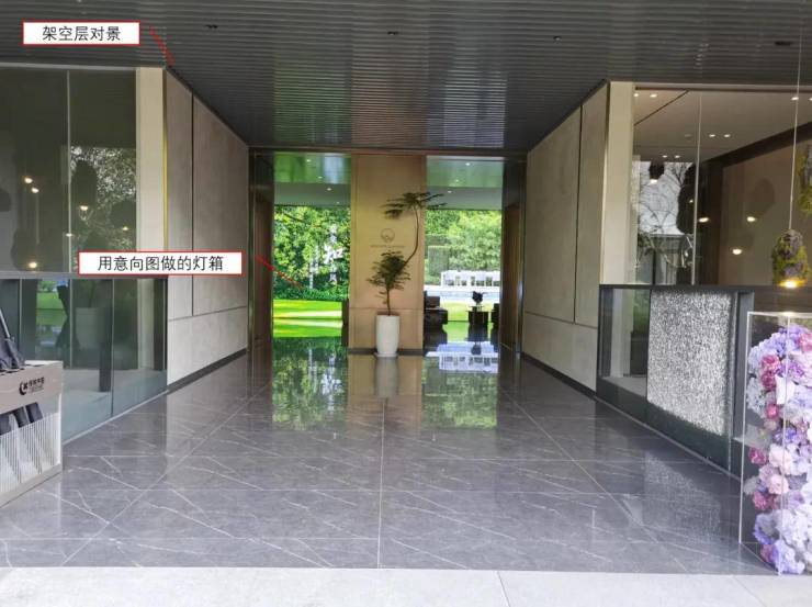 下面这张图,是刚进入架空层时看到的对景画面,远处的绿色部分,是用意向图制作的整面墙灯箱