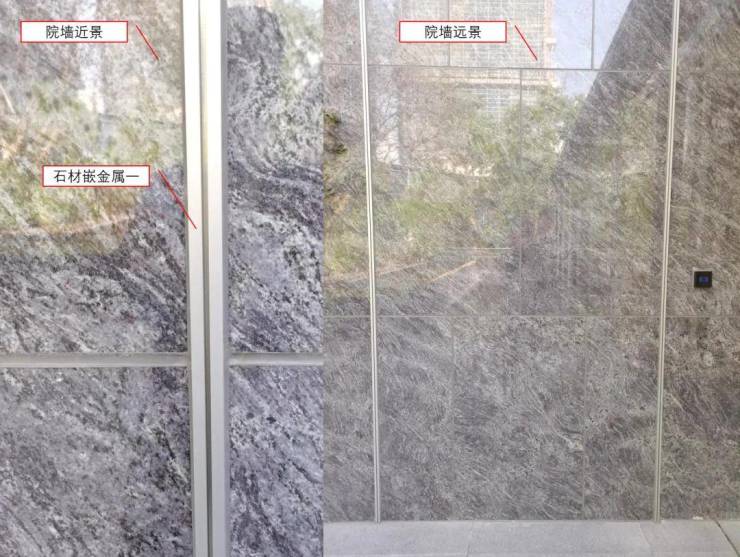 下面这张图展示的是示范区院墙,采用石材嵌金属工艺一