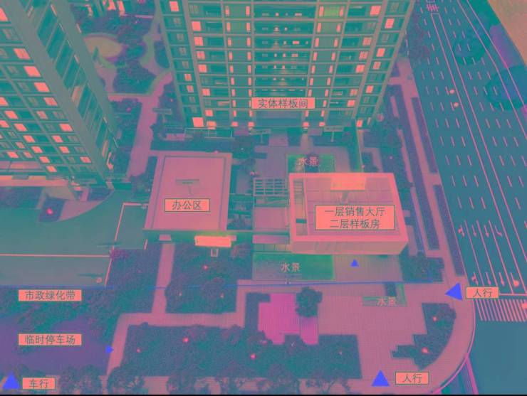 整个售楼处被市政绿化完全遮挡住了,尽管处于十字路口,但展示效果不尽人意。