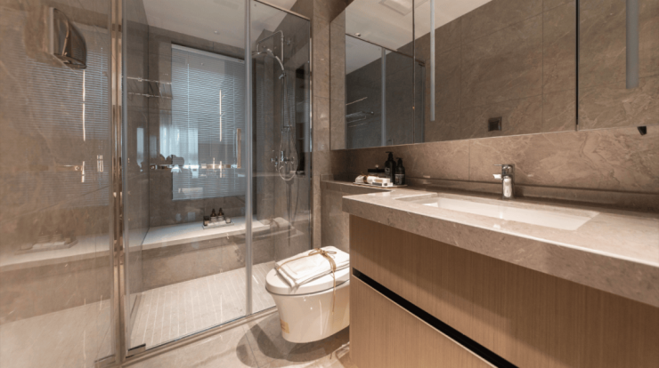 全系双明卫空间,配置科勒壁挂马桶与悬挂式浴室柜,底部悬空设计让清洁零死角;防滑石材中岛与定制淋浴屏,兼顾安全与颜值。