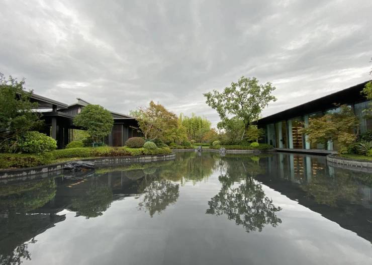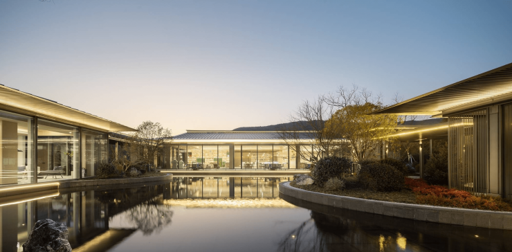 设计风格:融合苏式园林元素与现代玻璃格栅,采用“一轴六庭八景”布局