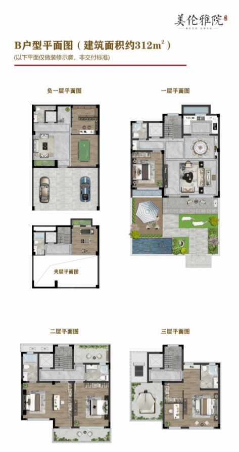 联排别墅:主力户型236-350㎡,庭院60-100㎡,总价288万-500万,配备独立车库(40-60㎡)及露台