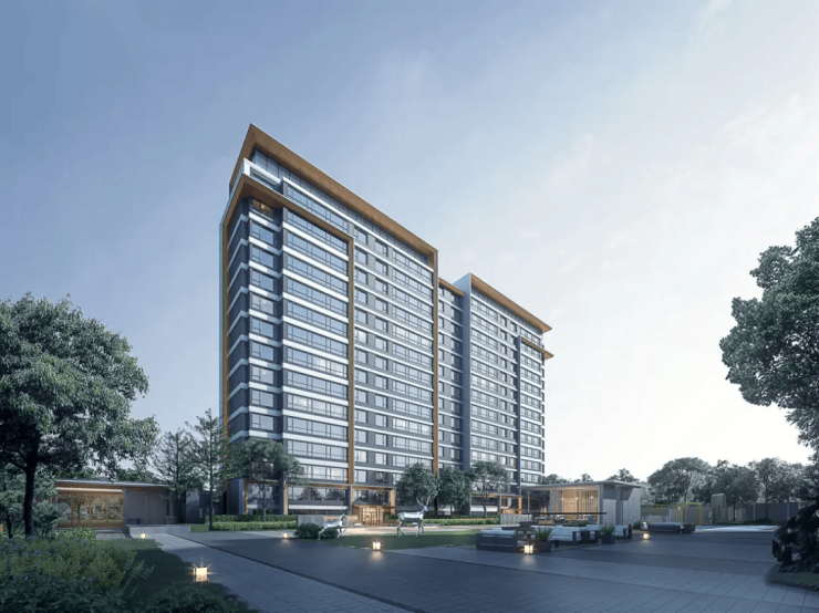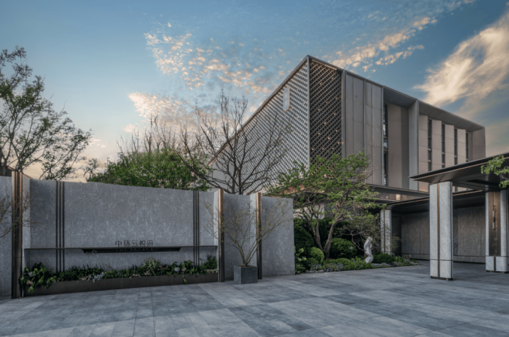 建筑风格:新亚洲风格,外立面采用石材+深咖铝板+大面积玻璃组合,呈现现代东方美学质感 。