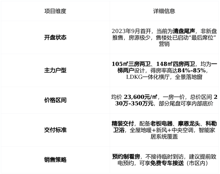 在售状态最后清盘阶段 ,主力户型仅剩少量105㎡三房与148㎡四房,均价约 2.36万元/㎡ ,总价 230万–350万