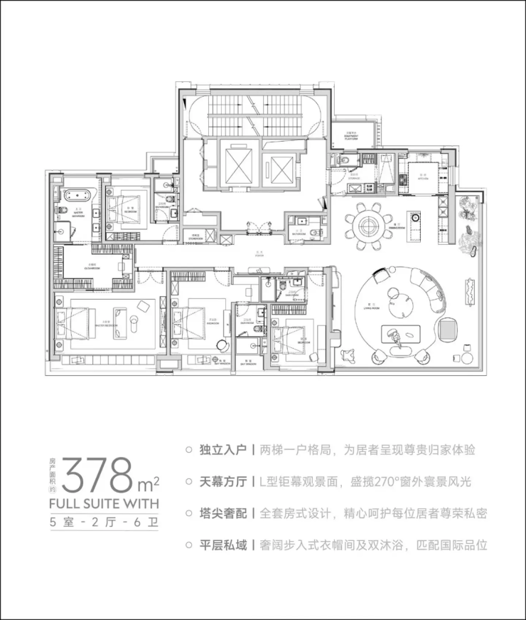 240㎡及以上四至五室:总价约850万至1,360万元,单价区间在35,400元/㎡至46,000元/㎡之间。顶层复式户型更是配备了私人电梯厅和星空露台,堪称圈层资产级产品,稀缺性导致溢价明显,部分带景观房源单价甚至突破4.8万元/㎡。