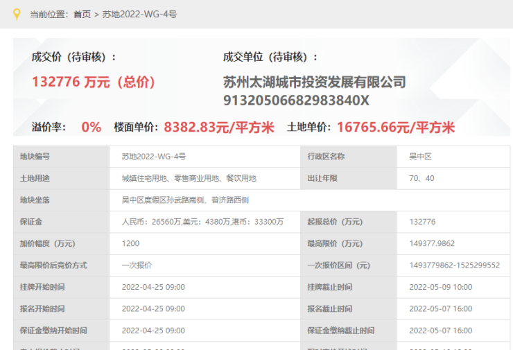 太湖朗郡,位于吴中区度假区孙武路南侧、普济路西侧,是2022年5月10日,苏州太湖城市投资发展有限公司以底价132776万元竞得,成交楼面价8383元/平。