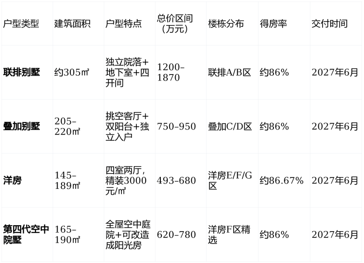 温馨提示 :目前 联排别墅剩余不足10席 ,叠加别墅余量约15套,洋房主力户型(145–165㎡)仍有少量可选,建议优先锁定 东向或南向院落房源