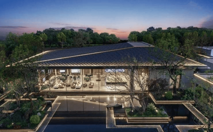 园林设计融合东方美学理念,采用"三进两轴十二园"布局,打造开放式景观空间,包含风雨连廊、水景庭院等特色元素