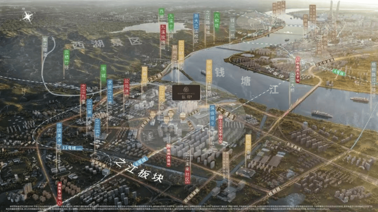 地段与景观:项目地处之江板块核心,北眺西湖群山,东望钱塘江,直线距离钱塘江约800米,享有稀缺的江景与山景资源。