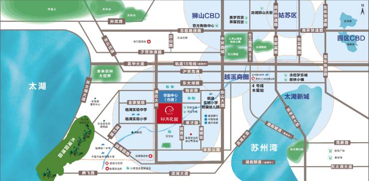 三横两纵路网:吴中大道、东太湖路、木东公路(三横);东山大道、浦庄大道(两纵),15分钟直达木渎商圈,25分钟到园区。
