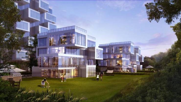 外立面:现代极简风格,玻璃幕墙与石材结合,低密楼间距达180米
