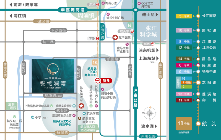 16号线“航头东站”:车程约10分钟,公交接驳或骑行5分钟可达,未来可换乘规划中的26号线。