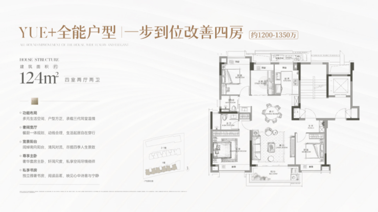 124㎡洋房四房:得房率高达78%,北向增设书房空间,主卧面宽约3.5米;功能空间均设大飘窗,提升使用率;卫生间采用汉斯格雅洁具与岩板墙面,主卫配备魔镜及美妆冰箱。