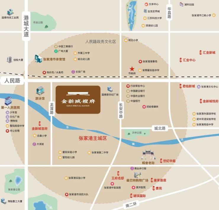 “买房看重地段”这一观念的底层逻辑,想必已无需过多阐述。檀府所处地段极为关键,它恰好坐落于张家港的中轴位置。此位置不仅是城市中心的物理标识,周边环绕着完备且成熟的核心配套设施,为居民的日常生活提供全方位的便利;更是深深烙印在港城人心中的文化象征与精神寄托,其所蕴含的巨大能量难以估量。|项目区位图