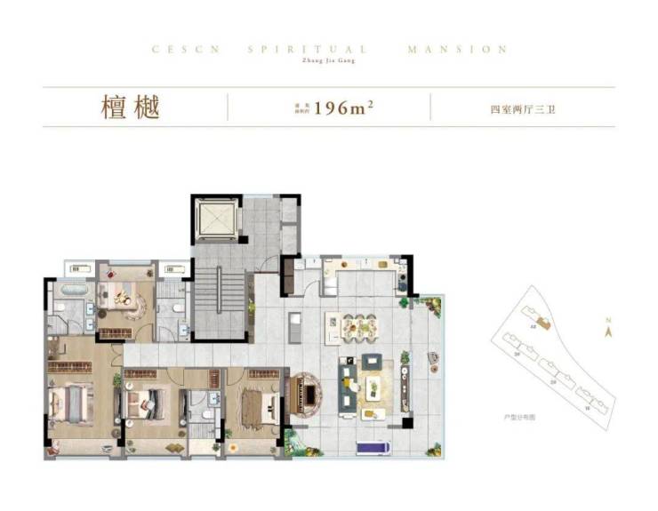 建筑面积约196㎡的四房两厅三卫户型