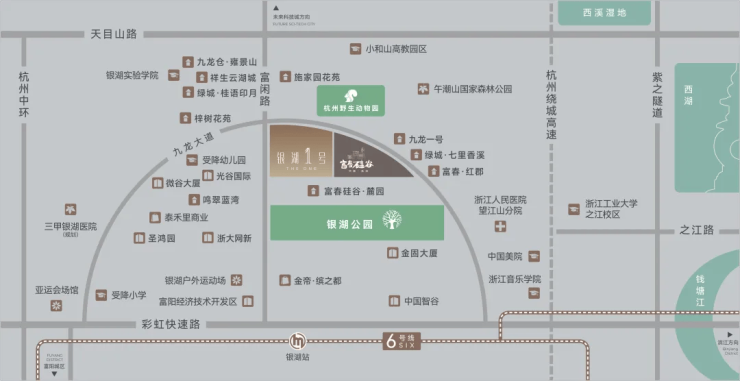 核心位置:项目位于银湖板块核心,东邻滨江区,北接未来科技城,南望富阳主城,处于三区交汇的枢纽地带。